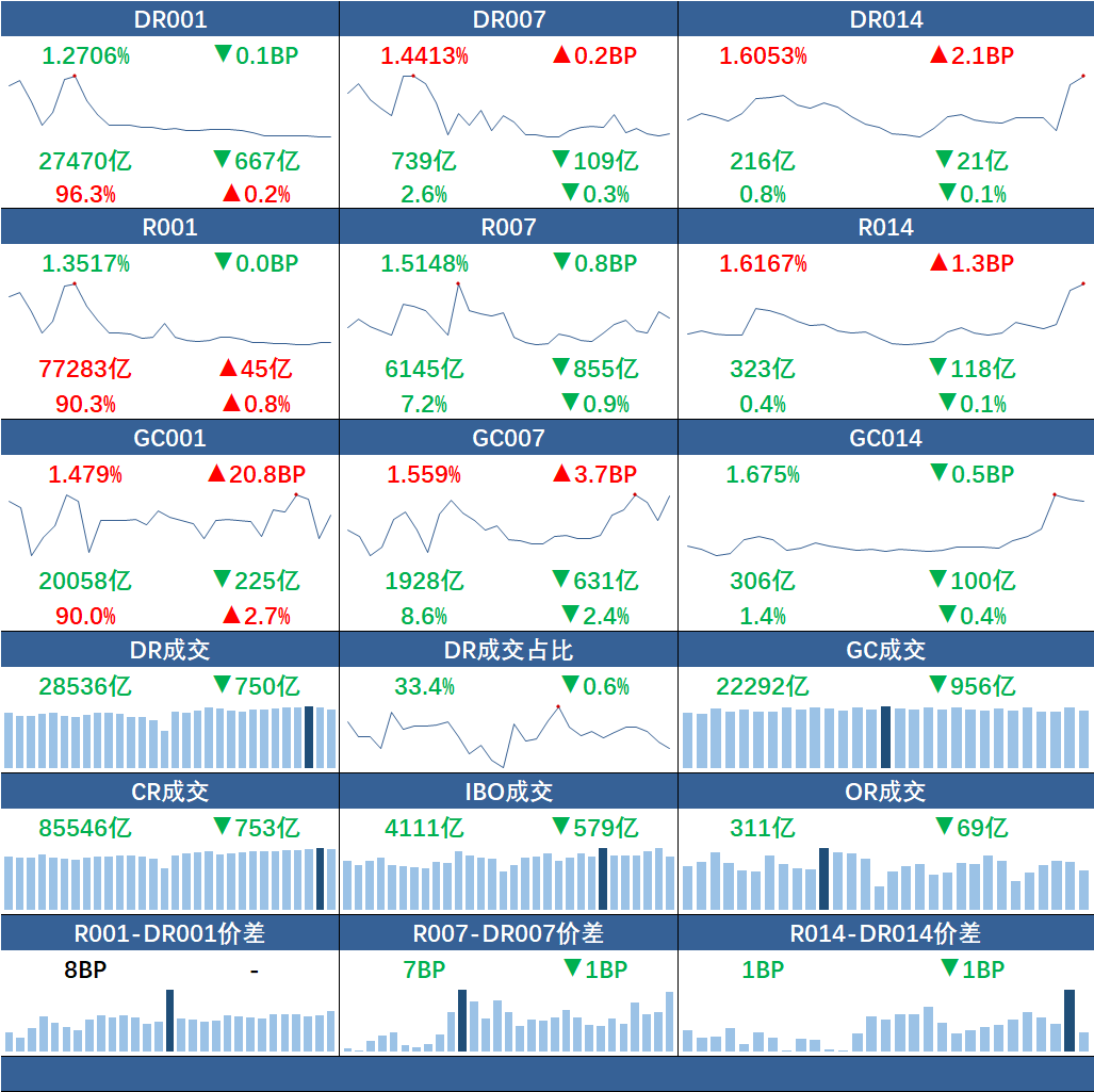 货币市场资金面均衡偏松。今日成交85546亿元。DR001加权1.27%,较前日基本持平,DR007加权1.44%,较前日基本持平。