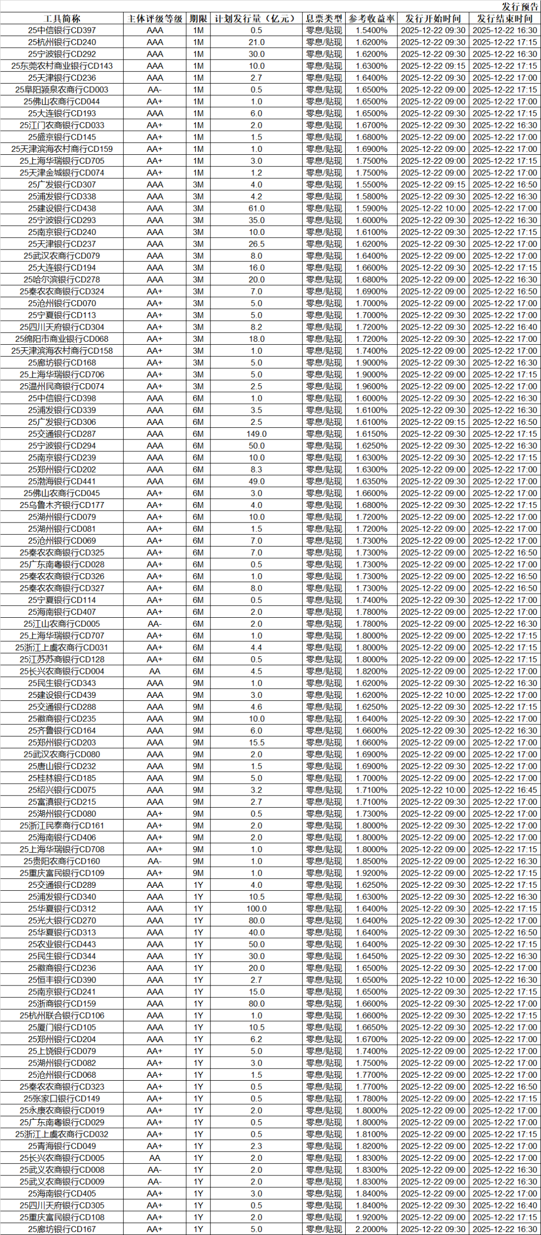 (三)同业存单发行预告
